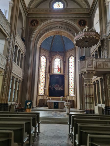Dort erfuhren wir von Herrn Jacob viele Einzelheiten über die Entstehung des Ortes und der Kirche. Über dem Altarraum, in Stein gemeiselt, steht der Spruch aus der Bibel: Ehre sei Gott in der Höhe.